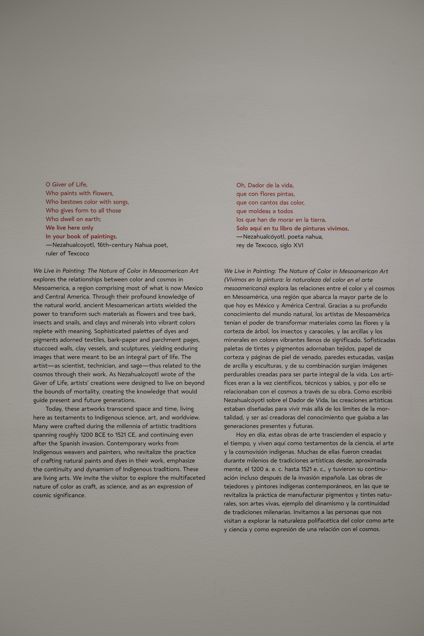 Mesoamerican artists held a cosmic responsibility: as they adorned the surfaces of buildings, clay vessels, textiles, bark-paper pages, and sculptures with color, they (quite literally) made the world. The power of color emerged from the materiality of its pigments, the skilled hands that crafted it, and the communities whose knowledge imbued it with meaning. Color mapped the very order of the cosmos, of time and space. By engineering and deploying color, artists wielded the power of cosmic creation in their hands. We Live in Painting: The Nature of Color in Mesoamerican Art explores the science, art, and cosmology of color in Mesoamerica. Histories of colonialism and industrialization in the “color-averse” West have minimized the deep significance of color in the Indigenous Americas. This exhibition follows two interconnected lines of inquiry—technical and material analyses, and Indigenous conceptions of art and image—to reach the full richness of color at the core of Mesoamerican worldviews.